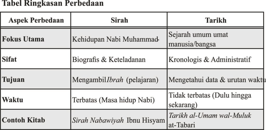 Dalam khazanah literatur Islam, membedakan antara Tarikh dan Sirah sangat penting untuk memahami konteks peristiwa yang sedang dipelajari. Berikut adalah poin-poin perbedaannya: